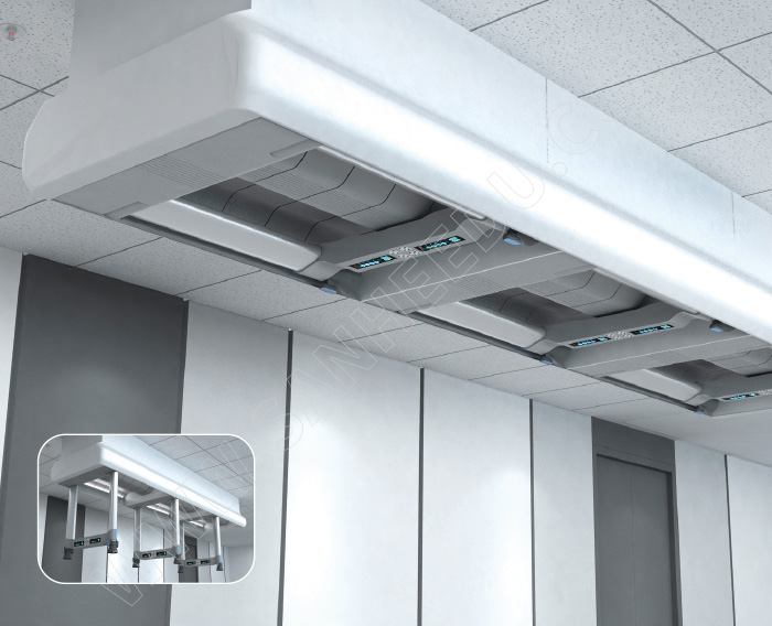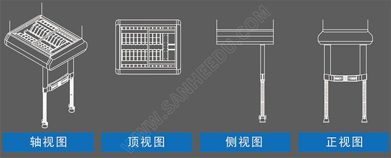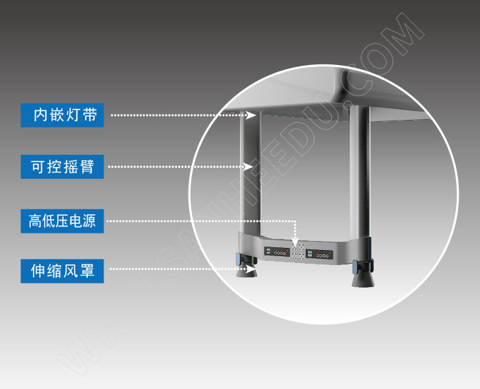 搖臂構架收起時完全收入主體構架內,解放區(qū)域空間,保持視野通暢;放下時向下旋轉90度,使搖臂終端接近實驗桌臺面。