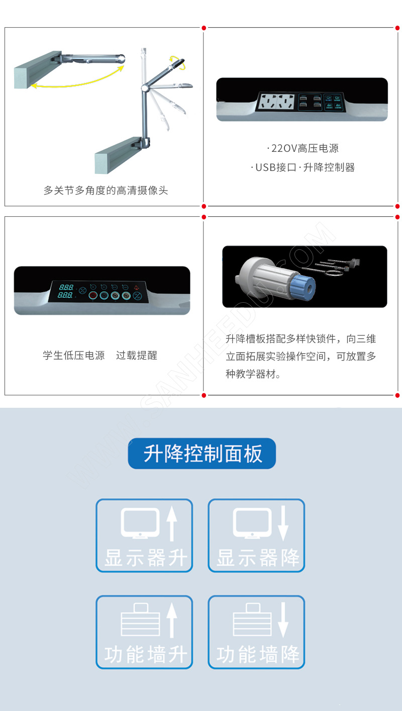 升降功能墻:內(nèi)置學(xué)生電腦、升降顯示器、兩個多關(guān)節(jié)多角度的高清攝像頭、USB插座、電源插座、控制開關(guān)、槽板、配合快鎖件等